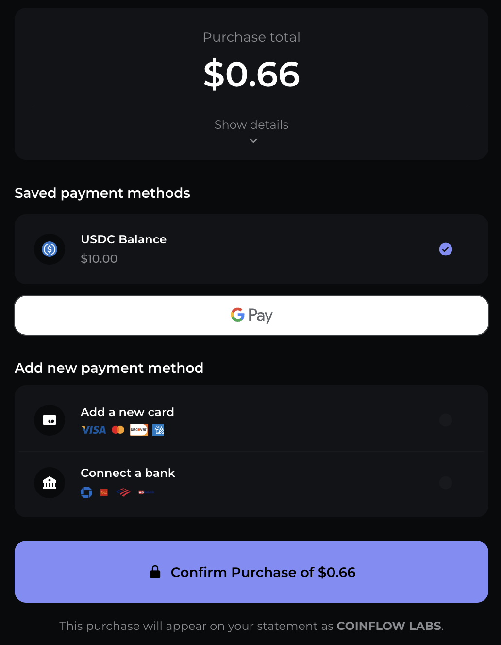 Developers can use this documentation to enable users to complete a purchase with USDC.