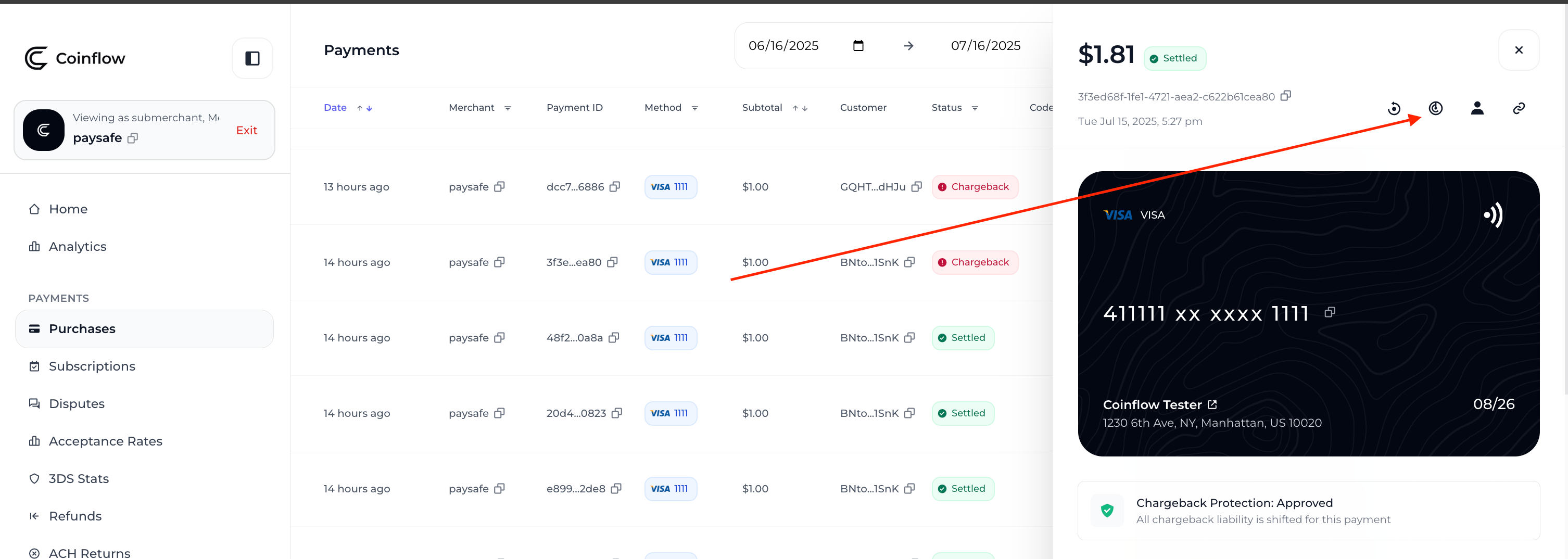 • Open a chargeback for the test payment