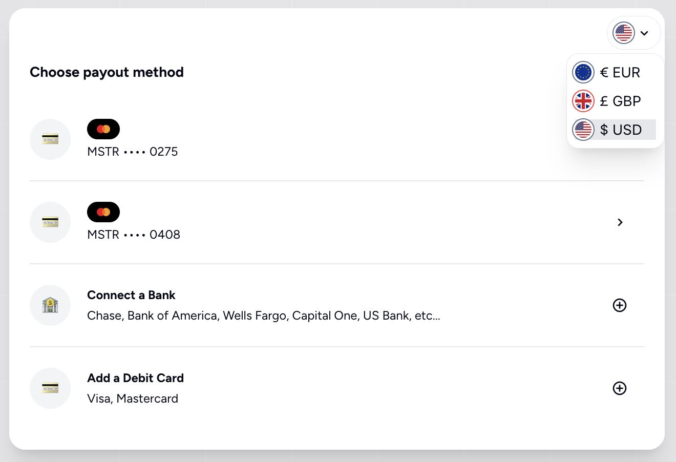 Withdrawers can also change their currency directly through the Coinflow UI. To do this, they can click the dropdown in the top-left corner of the modal (next to the country flag) and select an available currency based on their verification status.