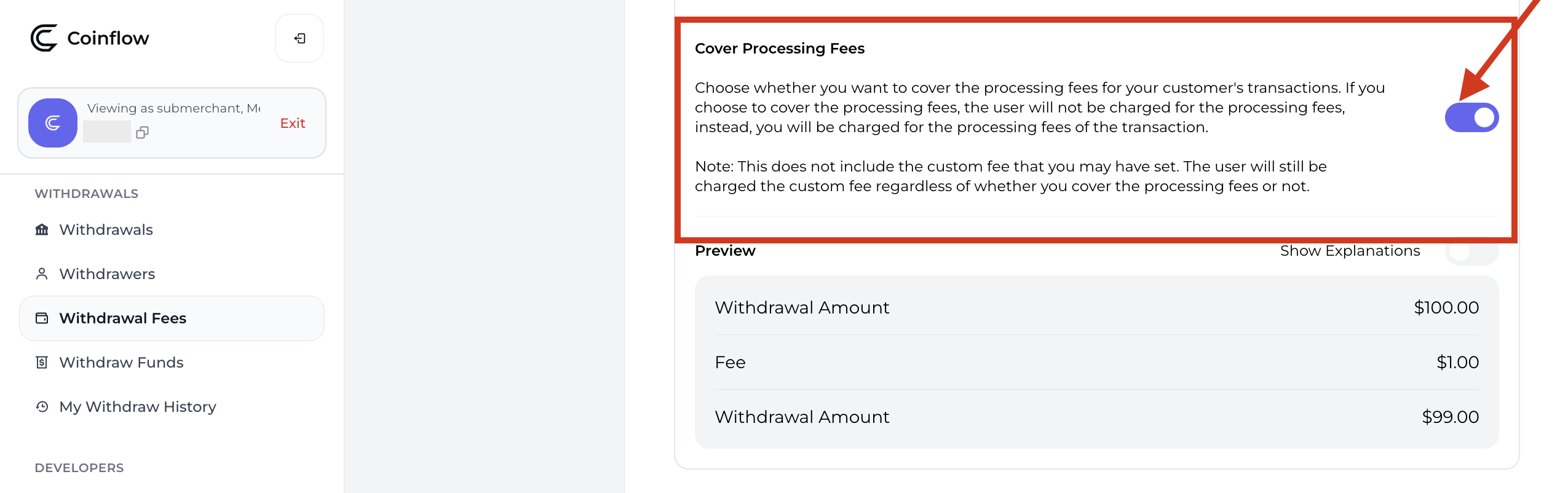 Merchants who have set up their Coinflow wallet settlement location can set their own custom withdrawal fees directly in the dashboard. By default, processing fees (the service fees Coinflow charges) are passed directly to the customer. Merchants can choose to cover these fees if desired.